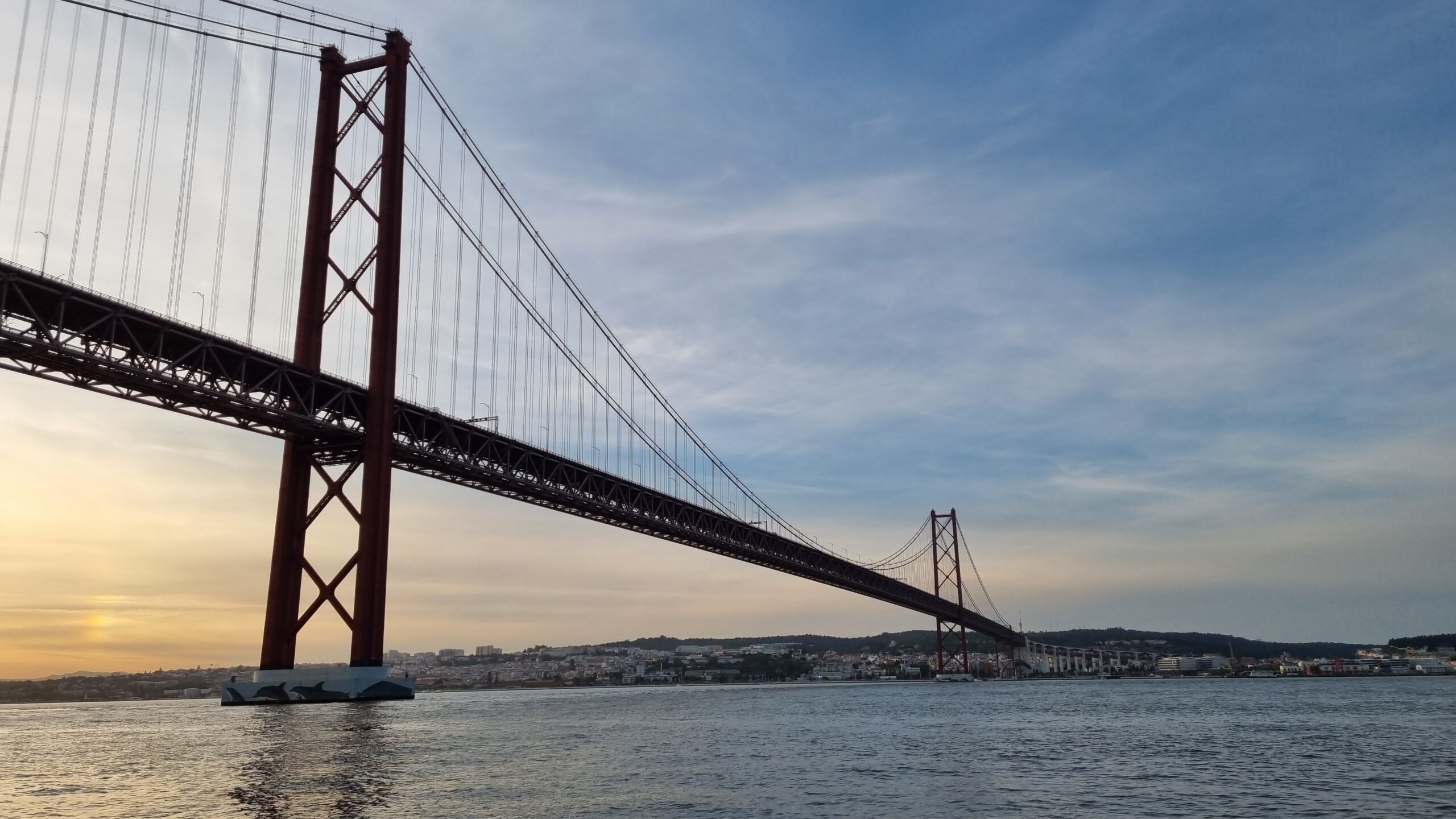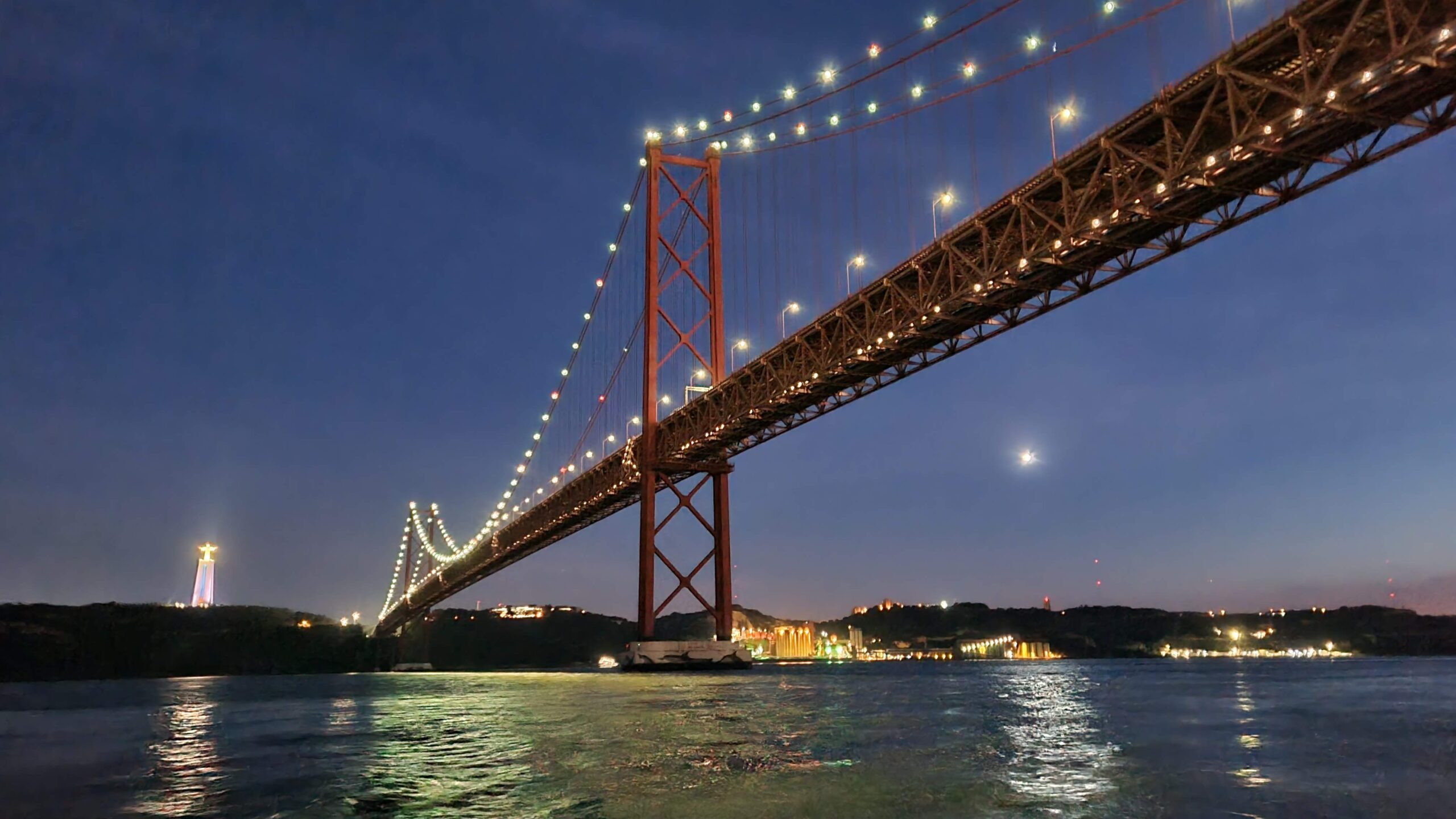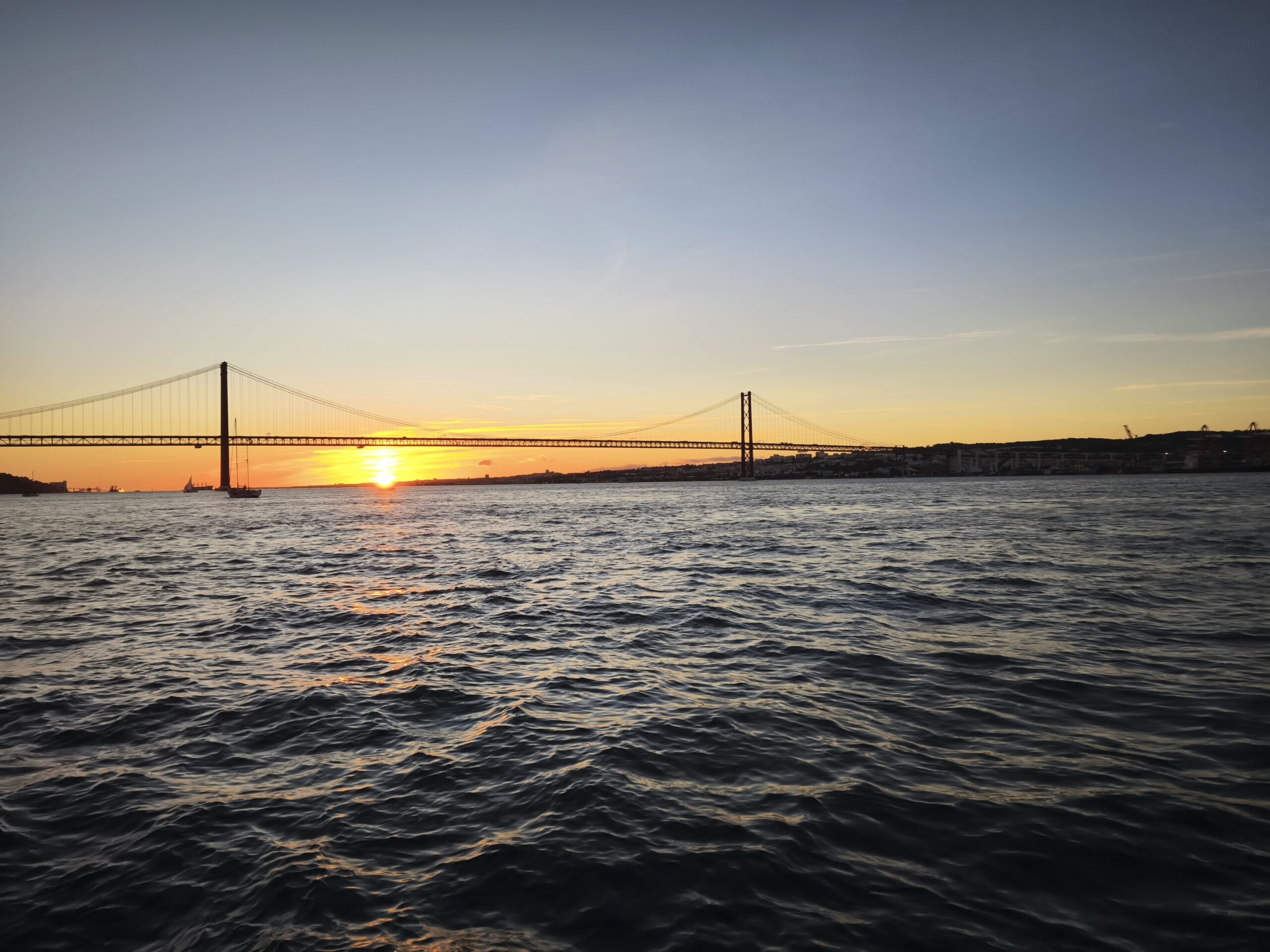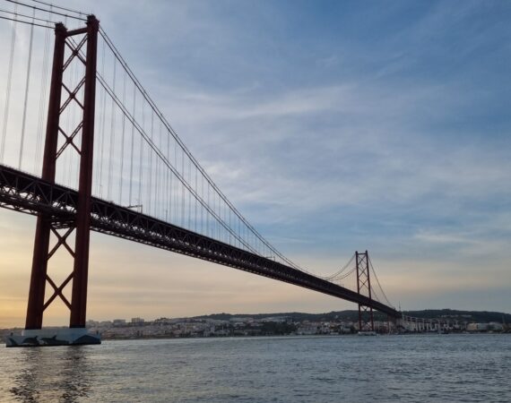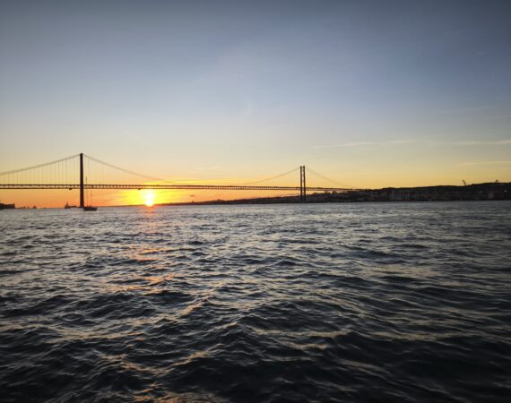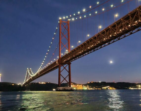 Navegue por baixo da icónica Ponte 25 de Abril, uma impressionante ponte suspensa vermelha que atravessa o Rio Tejo. Inaugurada em 1966, liga Lisboa a Almada e oferece um dos cenários mais fotogénicos da cidade — especialmente ao pôr do sol.